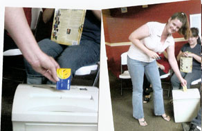 Here are some happy people! Shredding credit cards in the “holy shredder”.