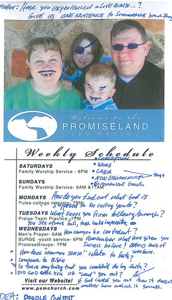 I take notes, just about every service—feel like I have not done my job, if I don’t. I love to look back over the notes the following week. It definitely helps with sermon retainage. I have to admit that I usually don’t change the look of faces on the bulletin, but I do scribble/doodle some. Pastor has been doodling on faces for years!! Some stories on that! You should see some of our old PromiseLand Central church picture directories. Some real artwork there. š