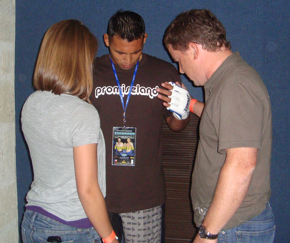 I am so proud of Bobby Hernandez. He is allowing the brilliant light of Jesus Christ to shine brightly through him while he competes in Mixed Martial Arts. Last Saturday, night several of us went to see him compete in his first amateur competition. The pic above shows me and Adri (his girlfriend) praying for him before the match. Notice the very cool shirt!