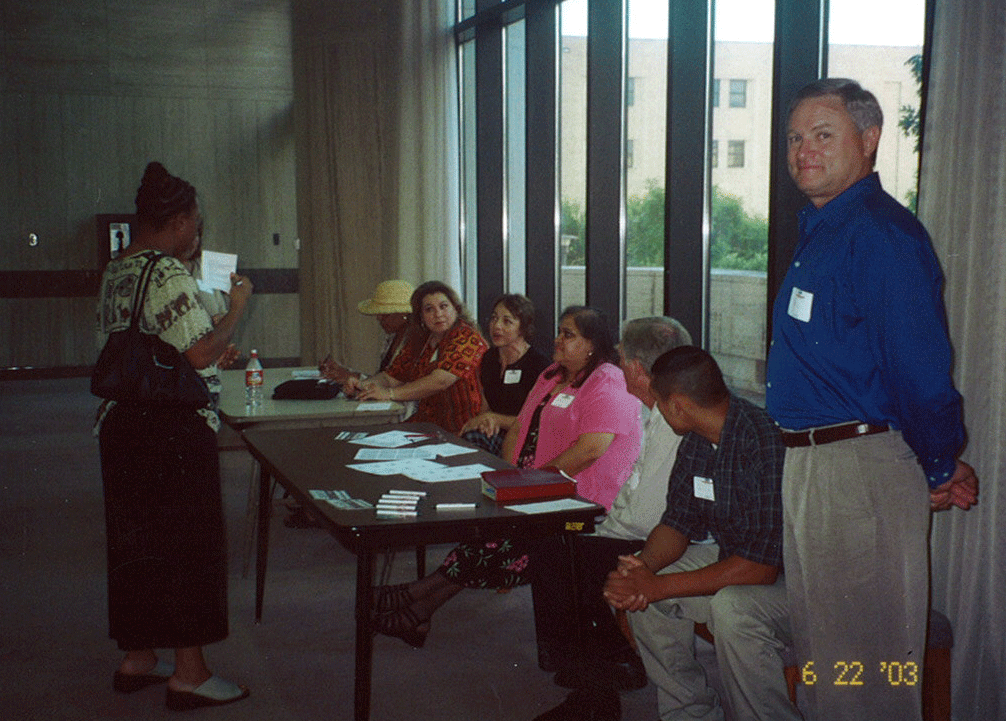 Look in the bottom right corner. 6/22/03 That was our third official service for PromiseLand San Marcos. The group of people behind the table were our official ‘greeters’ for that service. (notice nametags).